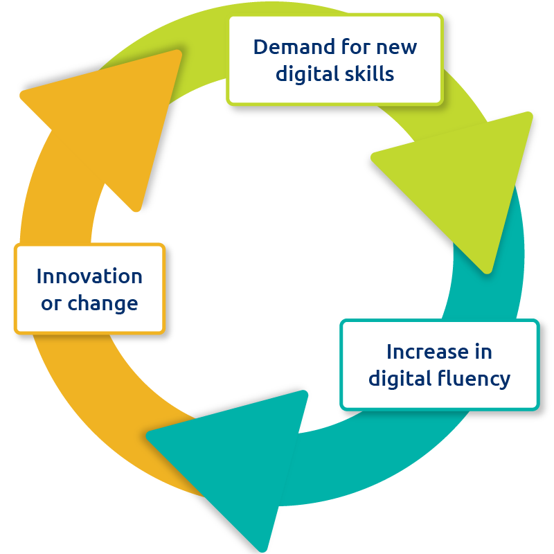 Keeping digital fluency skills current requires us to be a lifelong learners and adapt to new technology. Societal changes (or events) and innovations in technology drive demands for updated or new digital skills. Increasing access to digital fluency education closes skills and equity gaps and helps employers fill job vacancies. Having a digitally fluent workforce generates more opportunities for innovation, and so the cycle continues.
